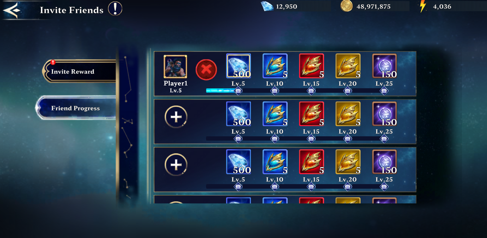 <figure><img src="https://461320705-files.gitbook.io/~/files/v0/b/gitbook-x-prod.appspot.com/o/spaces%2F0orn6g7PuksdX3M7UeDc%2Fuploads%2F0i8vL46y6qQqe6Gb0tqw%2FInvite%20Fr3.png?alt=media&#x26;token=d24292ca-249b-488a-87c9-d8c8d464a4f1" alt=""><figcaption><p><strong>Rewards are unlocked at specific milestones based on your friends' levels. The higher their level, the more valuable the rewards.</strong></p></figcaption></figure>